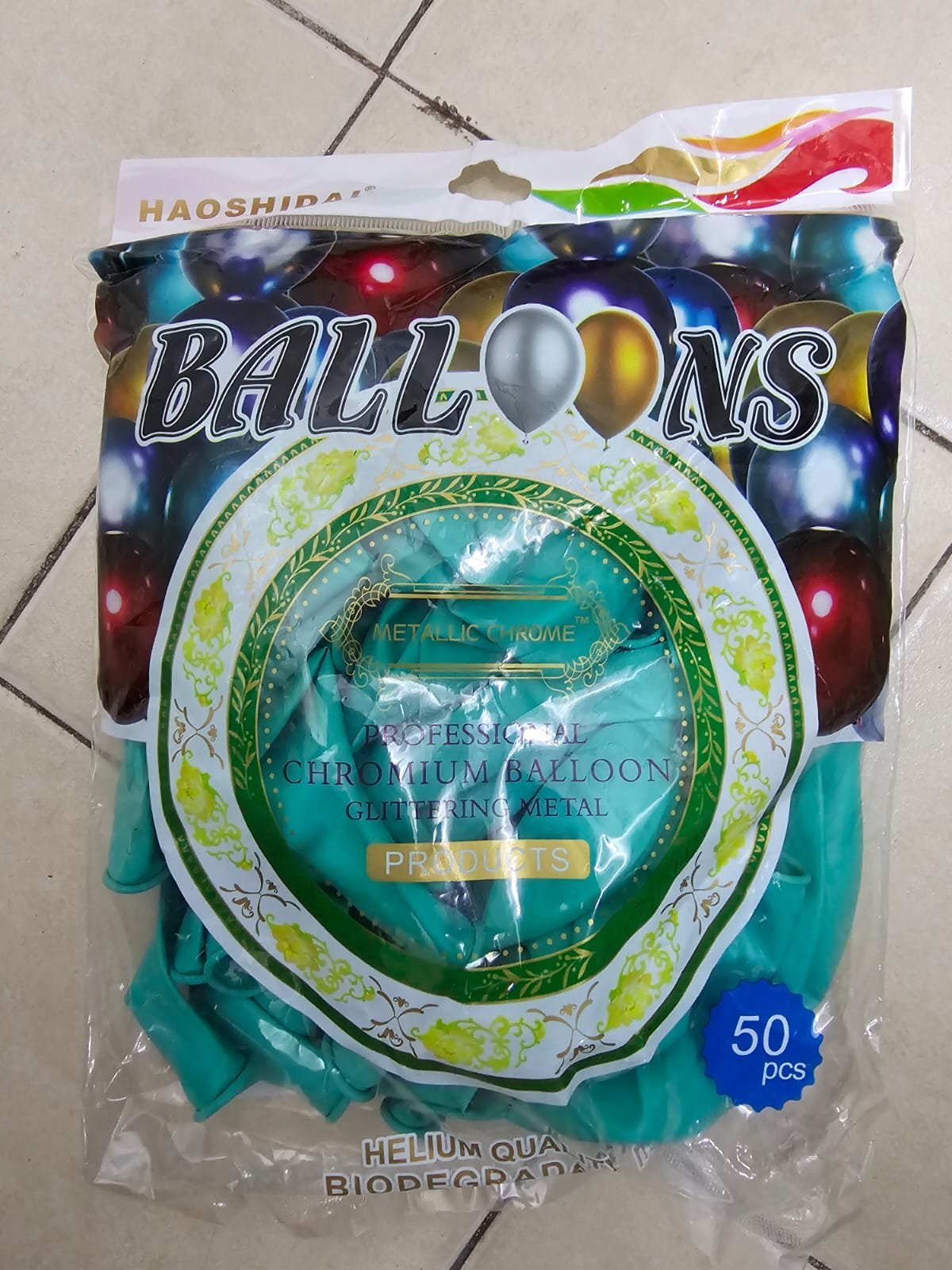 PAQUETE 50 GLOBOS LÁTEX HAOSHIDA VERDE CROMADO MENTA 12″ CALIDAD HELIO 1 PZA