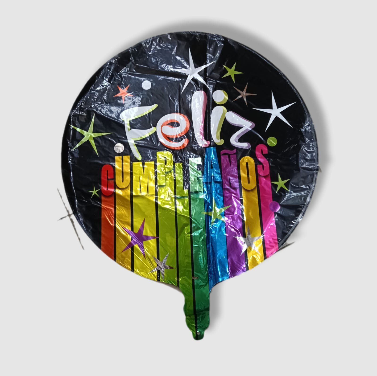 GLOBO METALICO REDONDO NEGRO «FELIZ CUMPLEAÑOS» ESTRELLAS COLORES 1 PZA